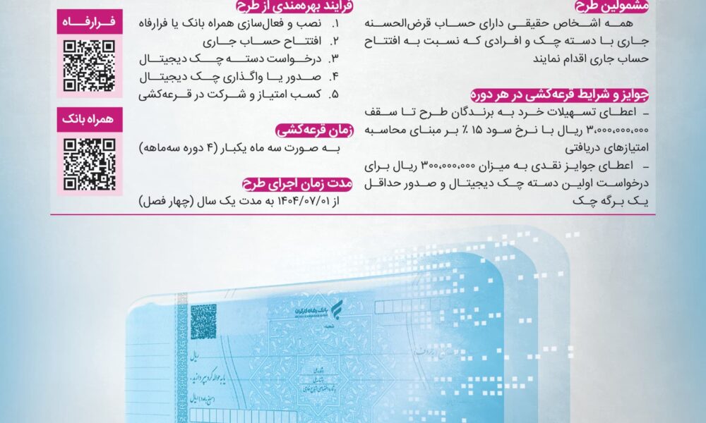 این طرح با هدف توسعه خدمات الکترونیک بانک رفاه کارگران اجرایی میشود و علاقهمندان میتوانند برای کسب اطلاعات بیشتر از و بهرهمندی از مزایای آن، به شعب این بانک در سراسر کشور مراجعه کنند.